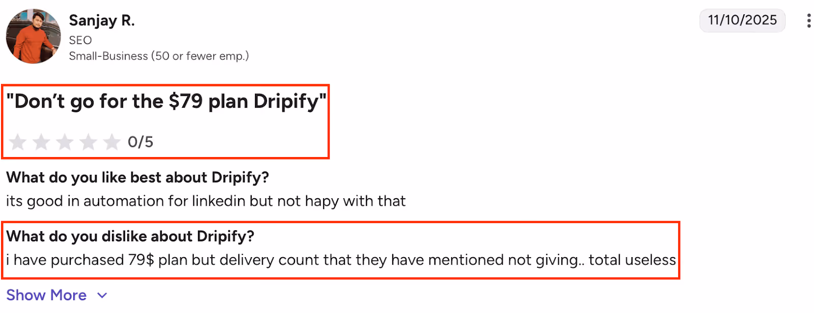 Pros: Create smart LinkedIn and email drip sequences with automatic follow-ups and delays. Built-in email finder and verifier for accurate contact data. Dedicated inbox lets you reply to leads without leaving Dripify.Add teammates, manage multiple campaigns, and share data across the team. AI personalization with 20+ variables to boost replies.Advanced analytics with clean visuals and real-time performance tracking. Works with Zapier and Make for smooth CRM or workflow integration. Cons: Alt text: Dripify review $79 plan didn’t deliver promised features; found it useless.