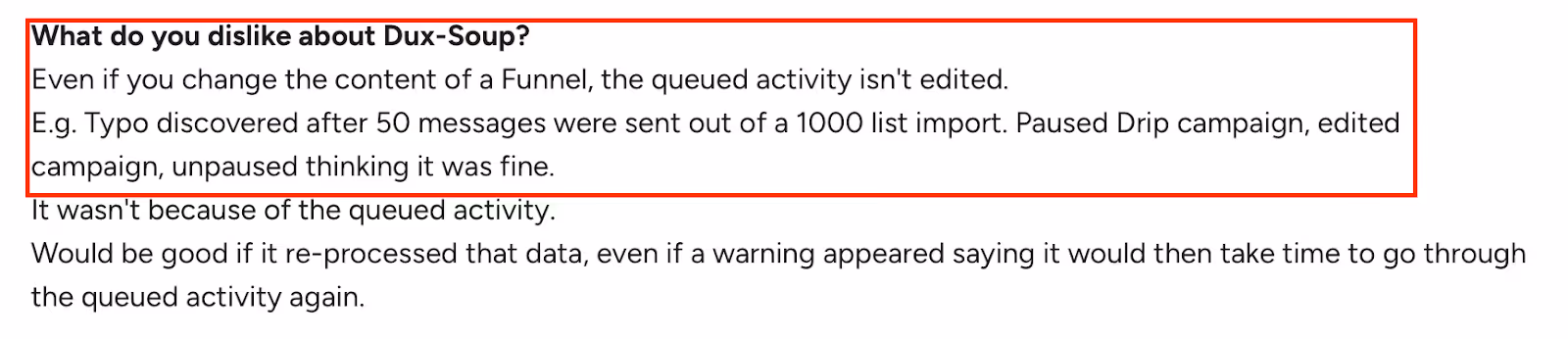 Pros: Chrome-based automation for quick setup and full control of your LinkedIn actions.Create unlimited drip campaigns with customizable delays and actions. Perform 12 LinkedIn actions, including follow, endorse, InMail, visit, and connect. Lead management dashboard for tracking campaign performance and replies.Central inbox for messages and responses from all campaigns.Export leads and email addresses directly to CSV or your CRM . Team versions let you share campaigns and avoid duplicate targeting. Cons: Alt Text: Dux-Soup issue on queued activities don’t update after edits, causing outdated messages to send.