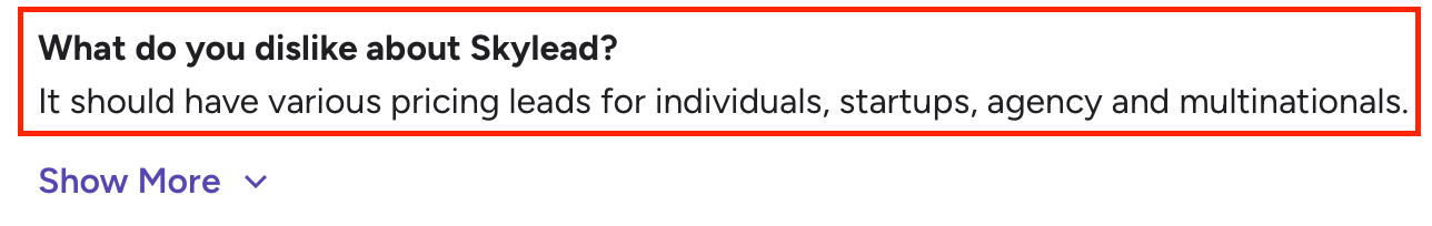 Limited audience tagging: Lacks internal CRM-style tagging to segment and organize LinkedIn contacts for targeted campaigns.Few template customization options: Users want more control over message and email template design.No built-in lead enrichment: Generates basic contact data but doesn’t offer deeper insights or event-based lead details.One-size pricing model: Current pricing doesn’t fully fit individuals, startups, or agencies with different needs.Alt text: User suggests Skylead should offer more flexible pricing for different business types.