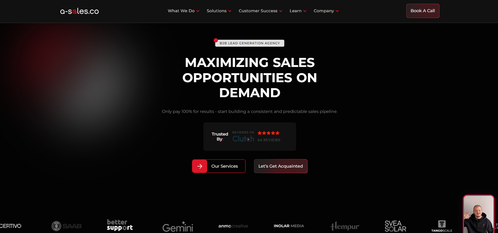 A-SALES AB is one of the clearest Sweden-based outbound specialists, with a Stockholm footprint and a sharp focus on sales outsourcing, B2B lead generation, and appointment setting. They are built for teams that want a full sales agency team to handle cold outreach, list building, targeting, and follow-up while the internal sales team focuses on closing. Their positioning is especially useful for SaaS companies and other B2B businesses that need predictable qualified leads instead of random bursts of activity.