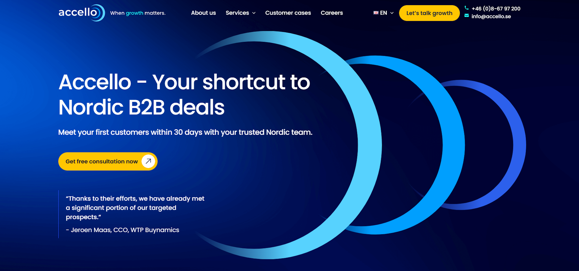 Accello is a Sweden-based B2B growth agency that focuses on appointment setting, new customer acquisition, and market expansion. Their service model is useful for companies that need a leaner sales agency team to manage cold calling, targeted outreach, and meetings without losing control of the broader sales process. They are especially relevant for organizations entering the Swedish market or other Nordic markets and wanting local expertise from the start.