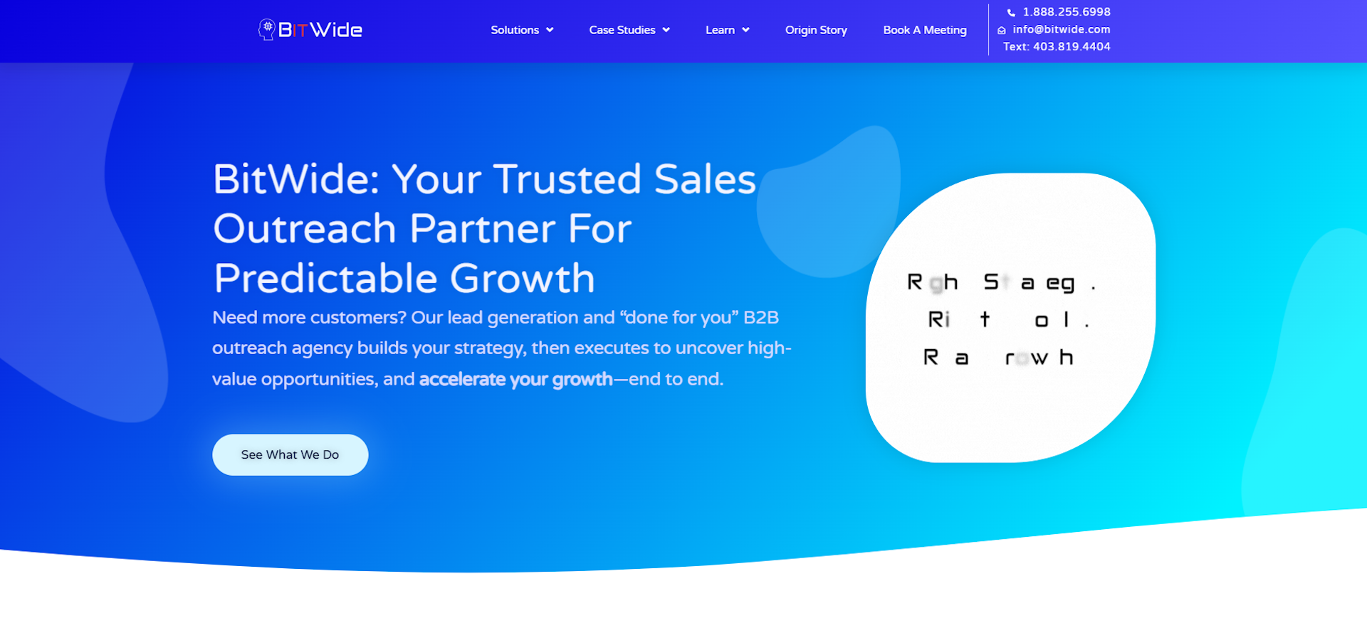 BitWide is a Canadian lead generation agency focused on multi-channel outbound prospecting: email, phone/cold calling, LinkedIn and social outreach. They present themselves as a sales outsourcing partner offering onshore talent and call center services for B2B campaigns, plus lead nurturing and verified database workflows to generate qualified leads. Their site makes clear they run cold calling campaigns and tailored outreach that feed a sales pipeline with high quality prospects for internal teams to convert.