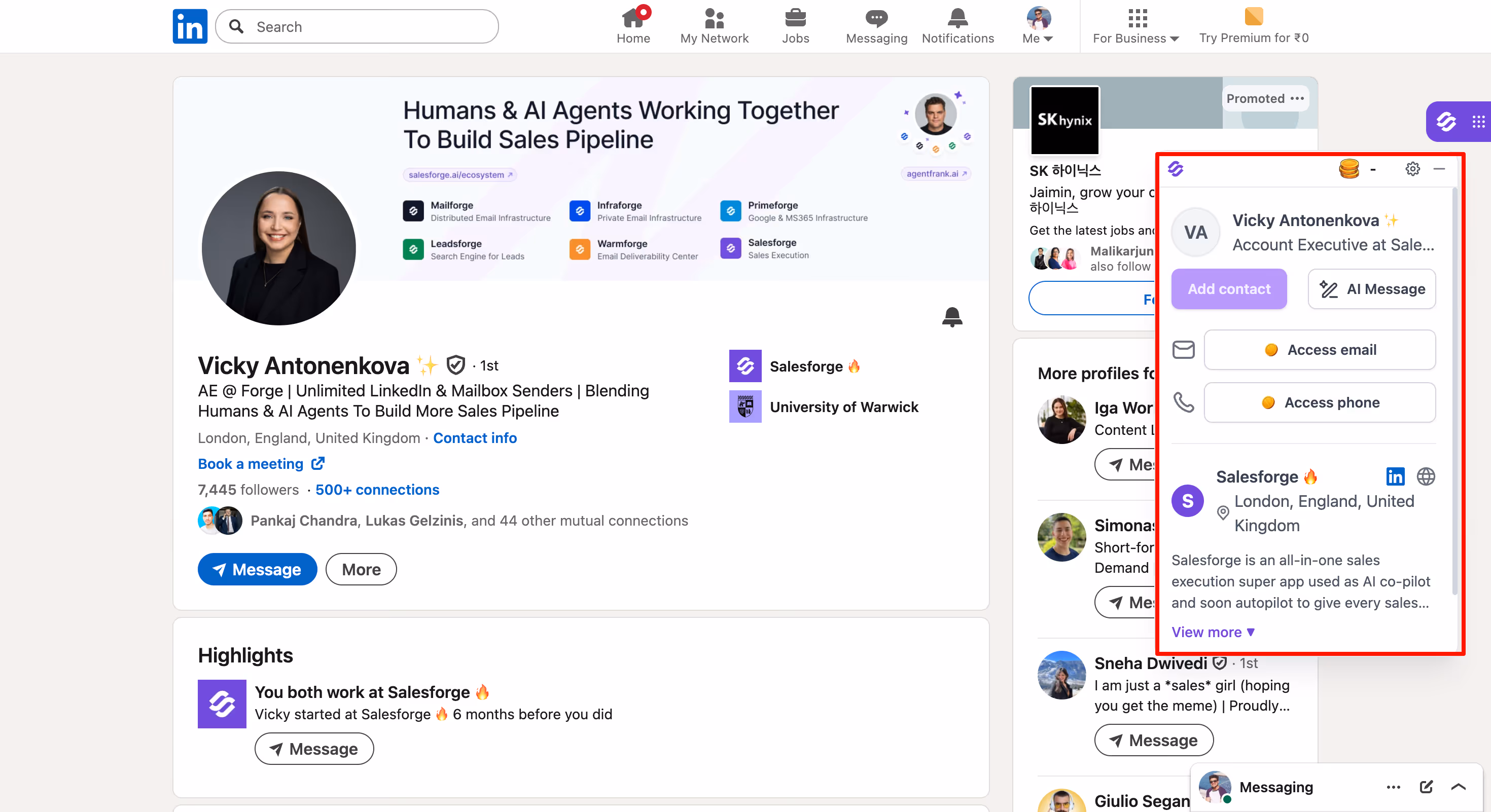 From any profile or page, the Salesforge extension adds a handy sidebar to find contact info. Unlike other email finder tools, Salesforge stands out with its seamless integration and one-click syncing to your outreach pipeline.
