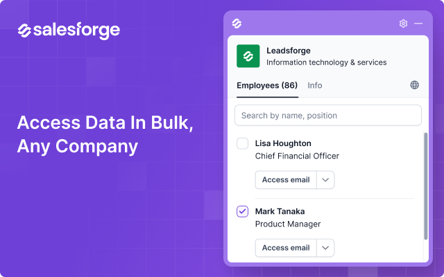 Prospecting shouldn’t take hours. With Salesforge, you can capture a lead’s business email or phone number instantly, enrich profiles, send tailored messages, and sync everything directly into your Salesforge account with a single click.